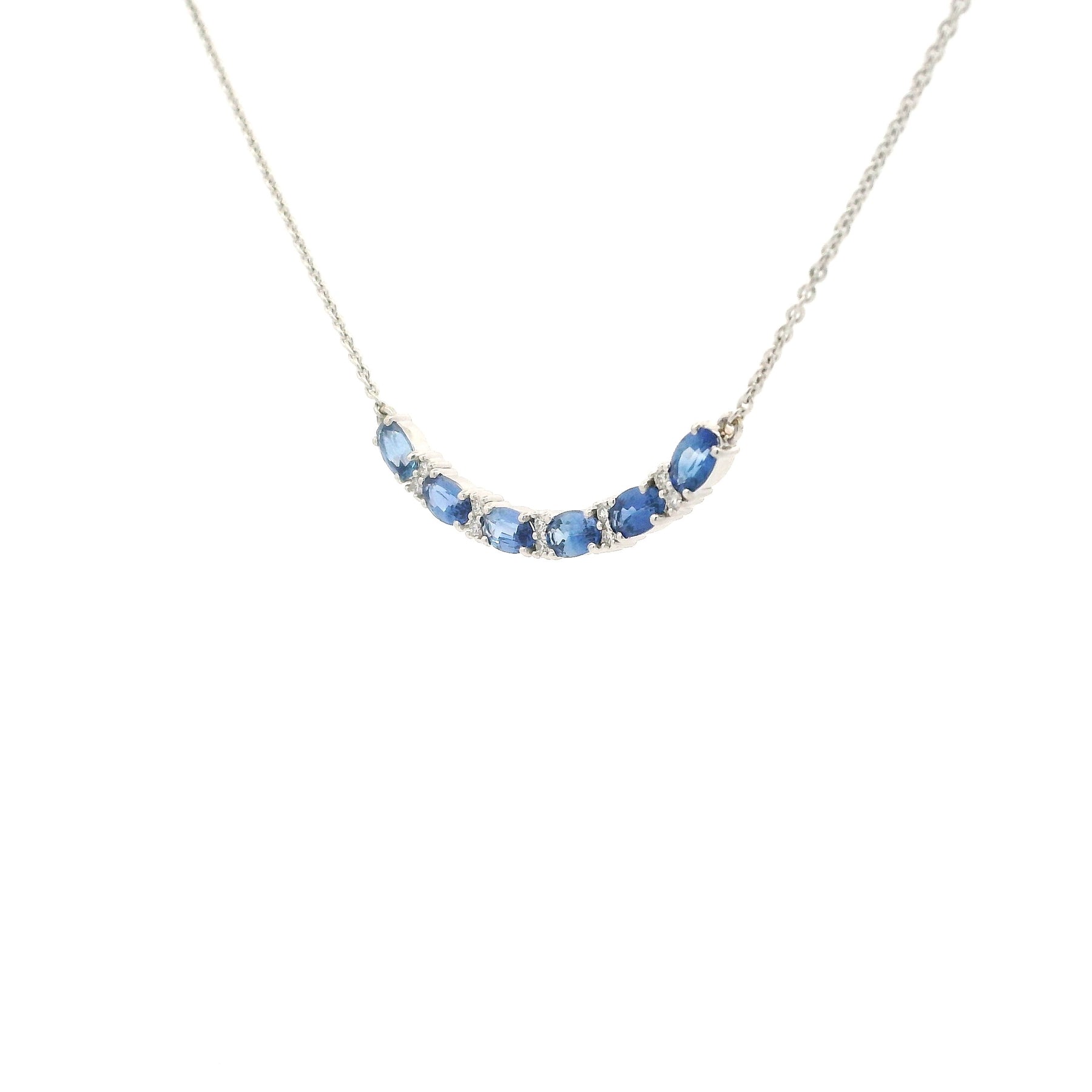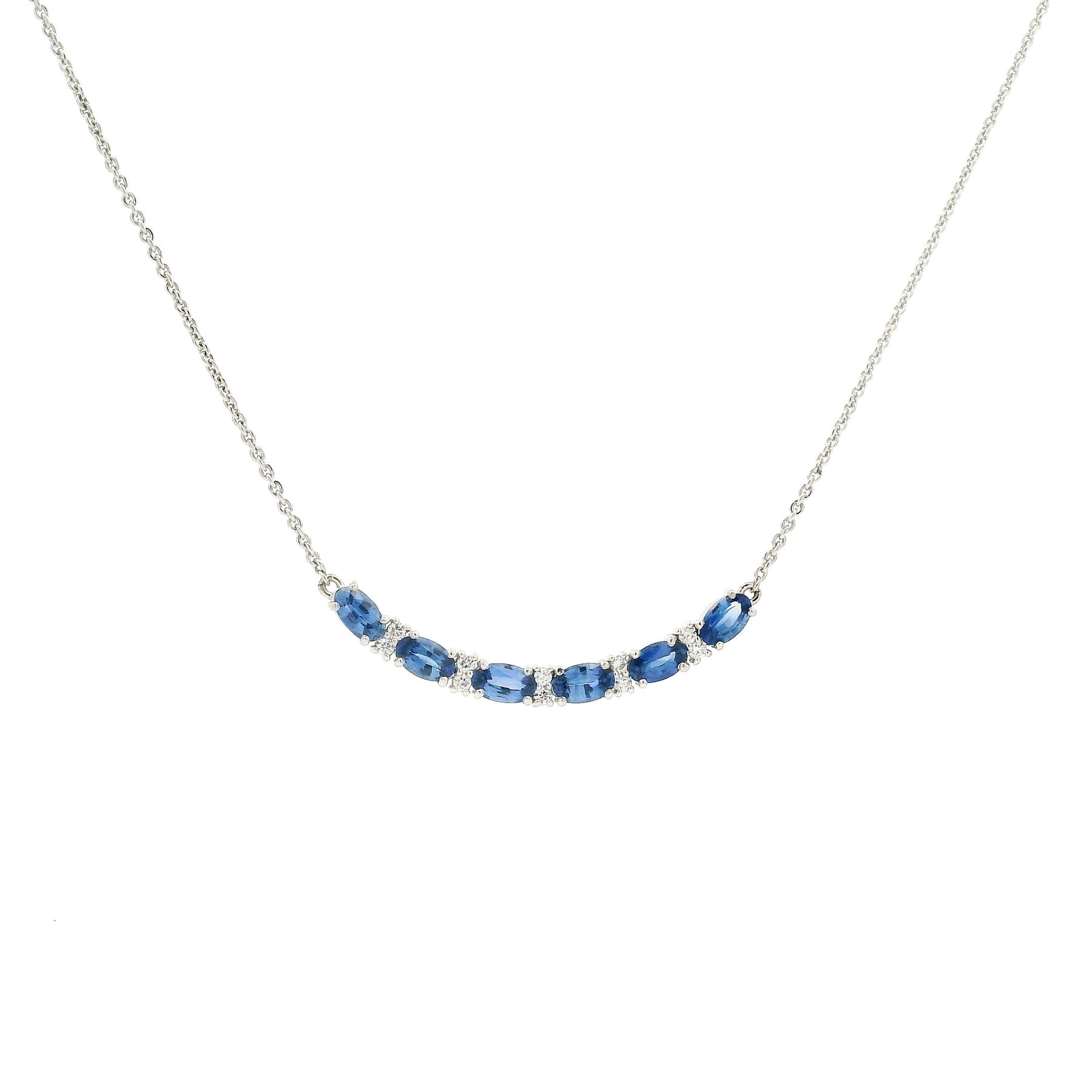 This poetic necklace features gorgeous blue sapphires, with delicate round diamonds set between. Its classic white gold setting enhances the color of the sapphires and fire of the diamonds, allowing the stones to take center stage on your neckline. This piece is for someone who loves tradition but isn’t afraid to embrace jewelry that stands out with subtle sophistication. It’s a refined, memorable statement that elevates any collection.
