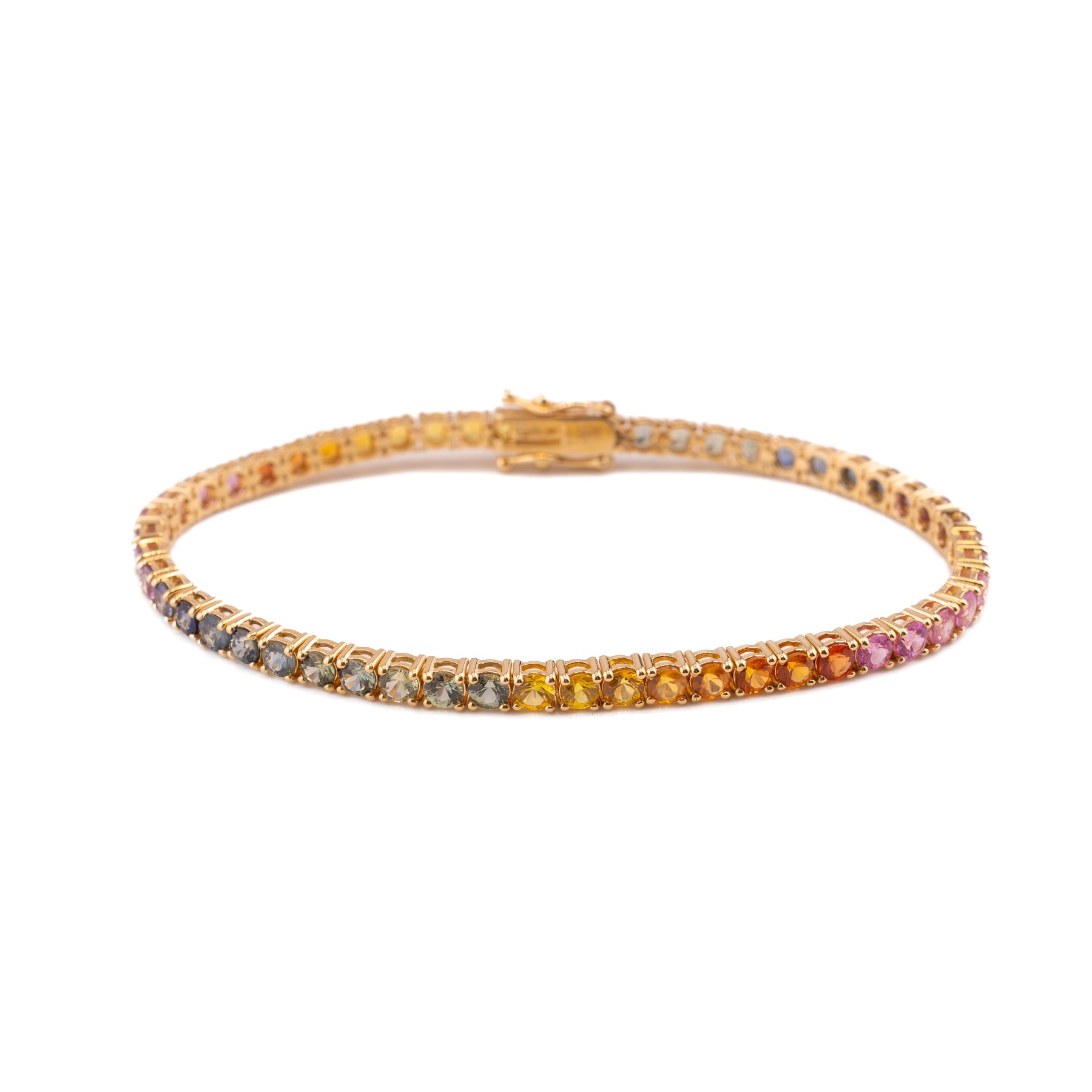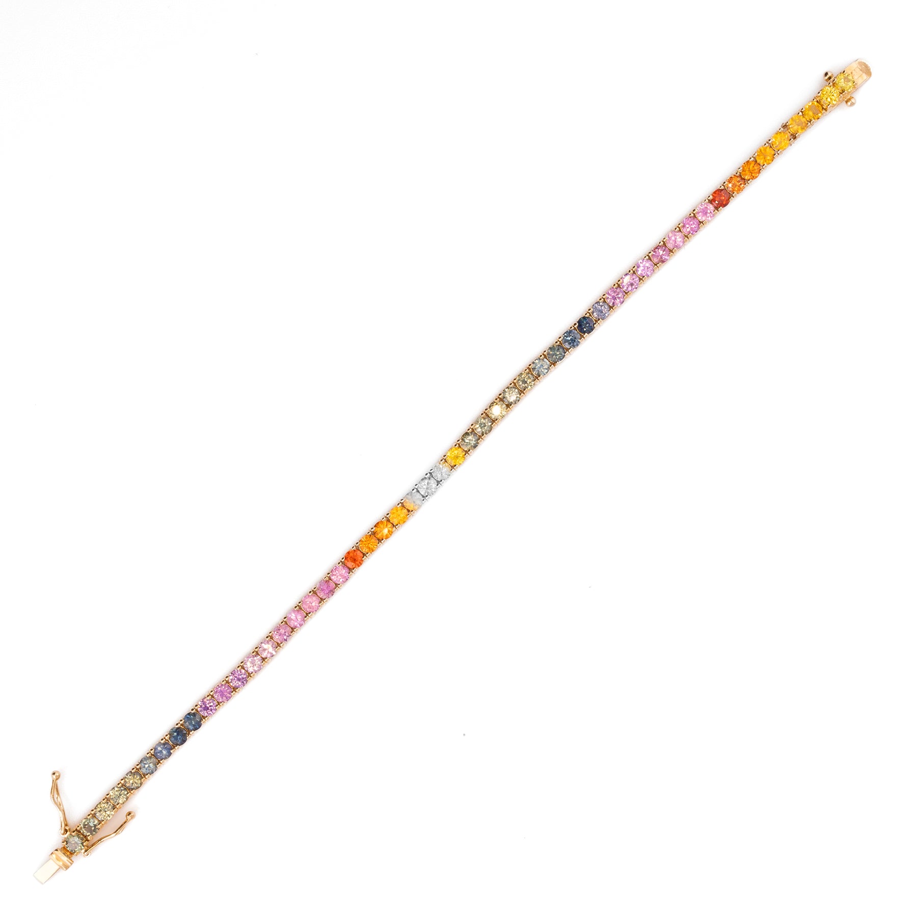 This delicate tennis bracelet features an ombré of multi-colored sapphires prong-set in warm, 14k yellow gold. From ocean blues to blushing pinks, this piece is equal parts playful and sophisticated. Whether worn solo or stacked, it’s your everyday reminder that color is joy, and joy is always in season. A clasp closure keeps it secure while you shine.