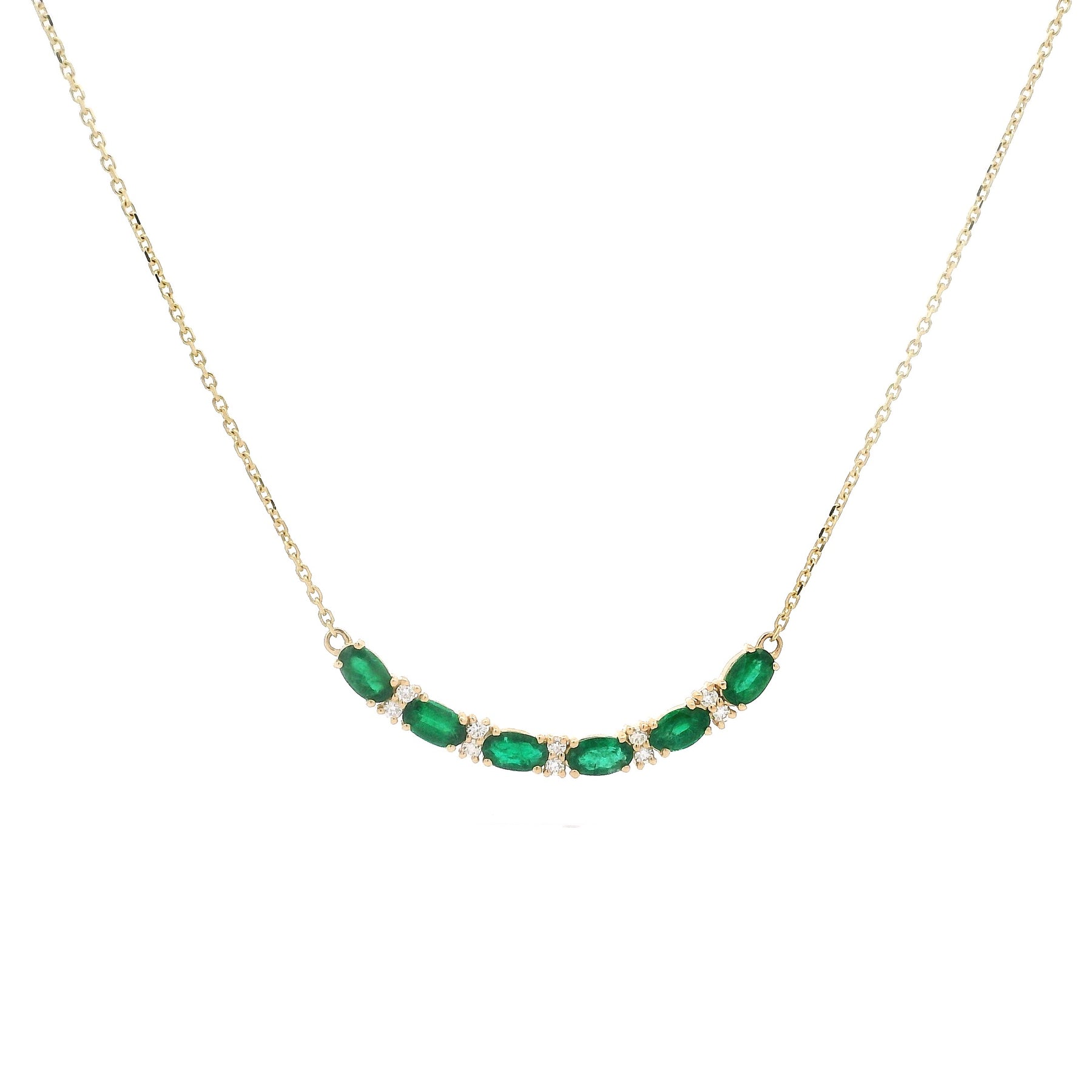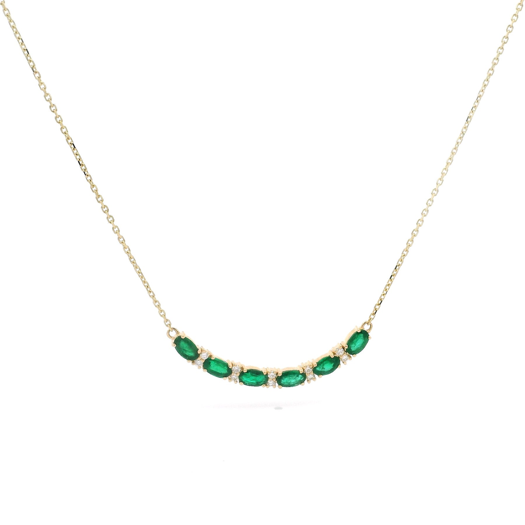 This necklace showcases a stunning row of vivid oval emeralds, with sparkling round diamond that adds contrast and light, creating a rhythm of color and fire across the neckline. Set in polished gold, the design is both luxurious and timeless—an heirloom-worthy piece that celebrates elegance in its purest form.