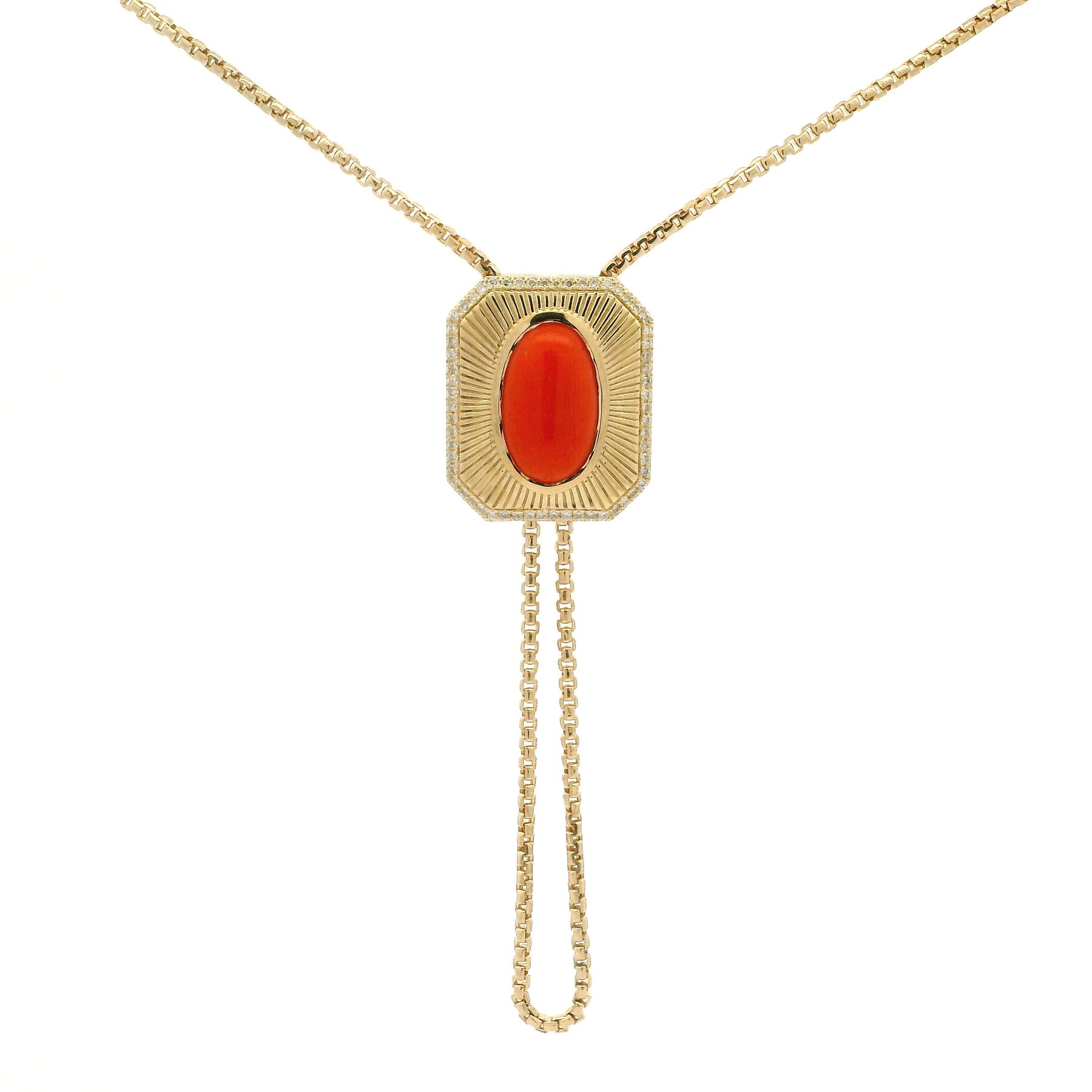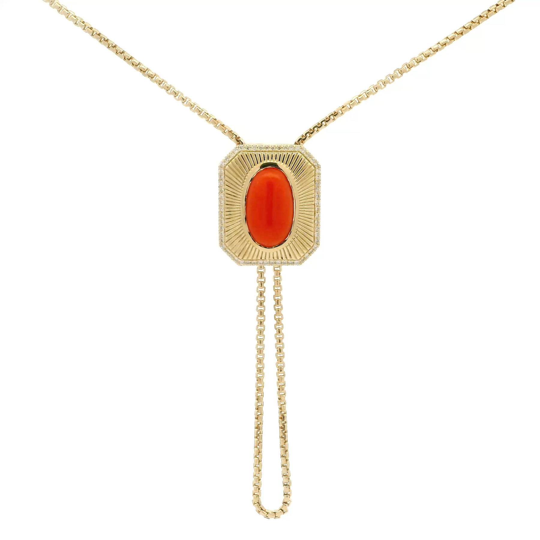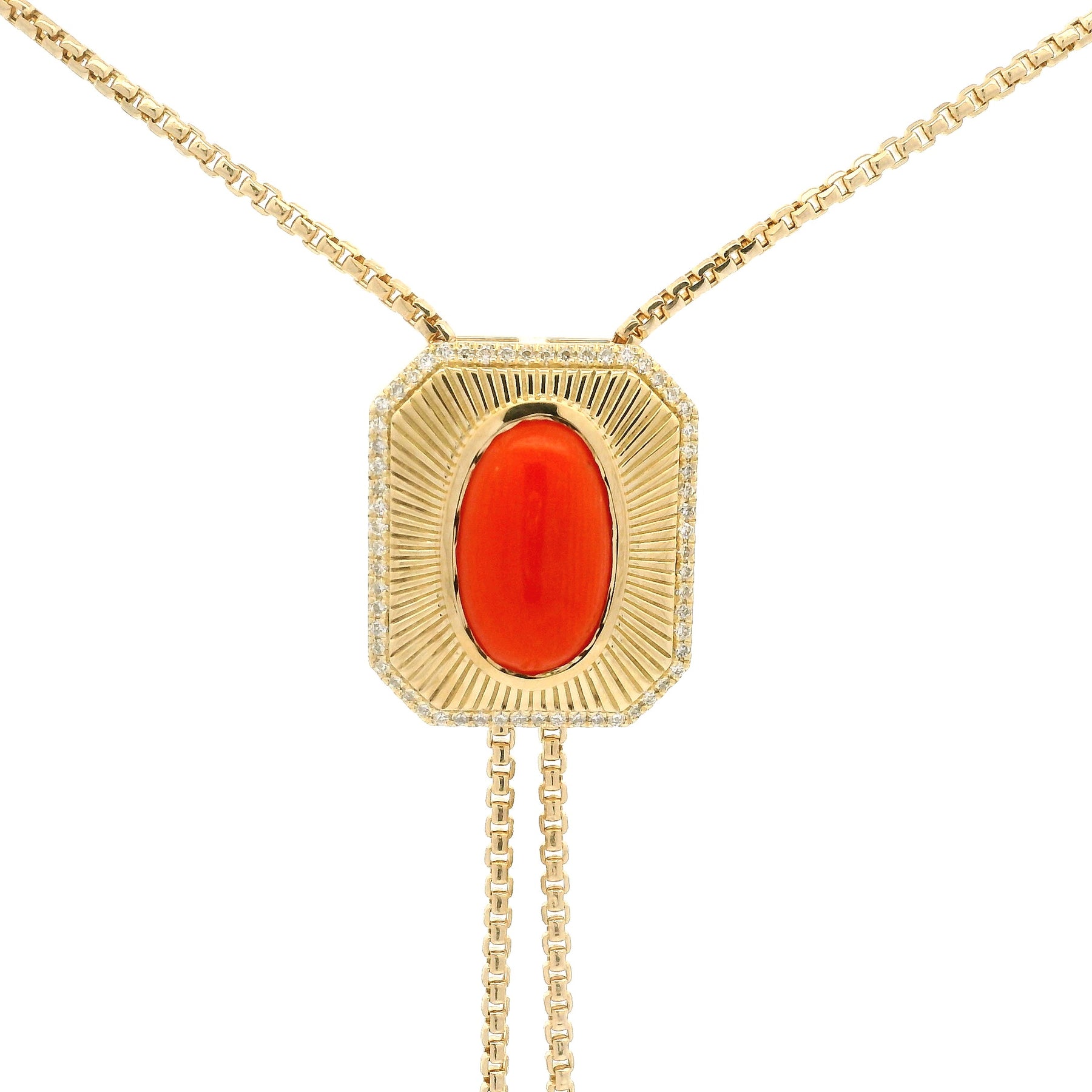 This striking necklace features a vivid oval coral gemstone set at the center of a radiant pendant. The coral is framed by a halo of pavé diamonds and surrounded by a lined gold design that adds texture and depth, catching the light with every movement. Suspended from a gleaming gold chain, the pendant’s architectural silhouette blends bold color with refined detail, creating a piece that feels both modern and timeless.