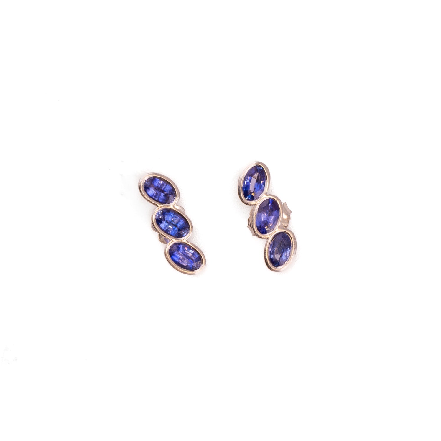 Featuring a cascading trio of bezel-set, oval-cut sapphires in a deep, velvety blue hue, these earrings are both sophisticated and edgy. The asymmetrical stack angles beautifully and adds intrigue to any style, making these earrings a striking addition to your collection.