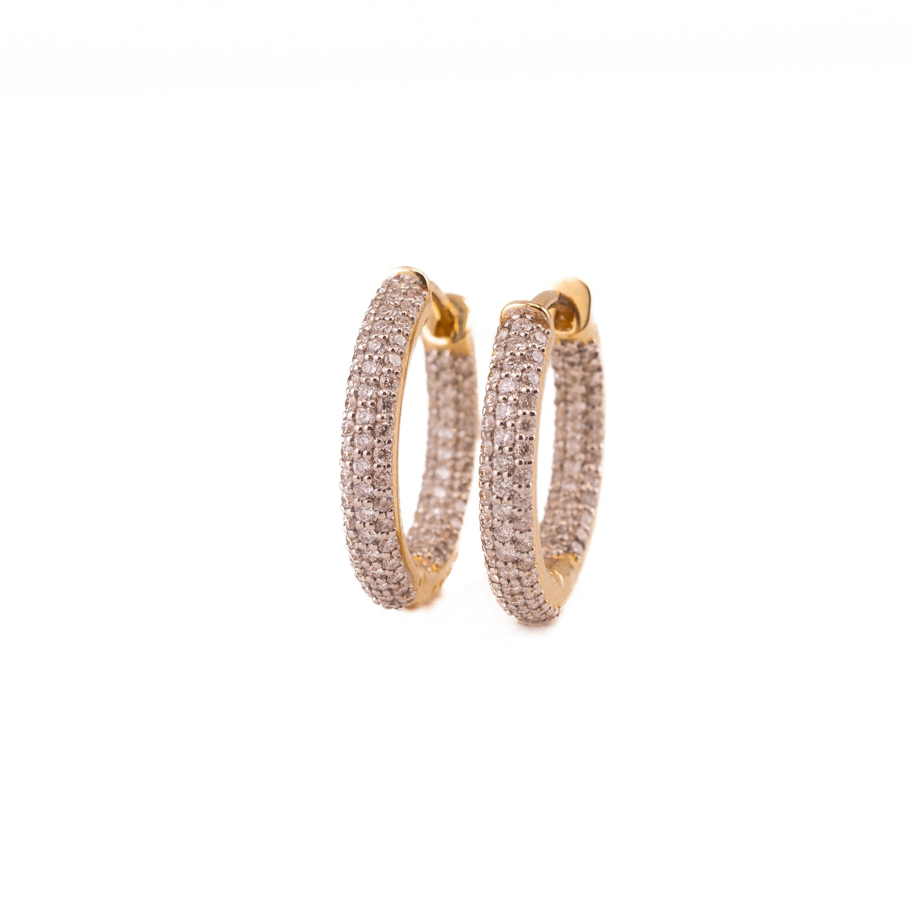 These inside-out hoops are the perfect addition to your everyday-wear collection. Crafted with meticulous attention to detail, each diamond catches the light from every angle, creating a continuous shimmer that feels effortlessly luxurious. Lightweight yet substantial, these hoops are designed for those who appreciate understated glamour with a contemporary edge. Whether worn alone or layered with other earrings, they bring a refined sparkle that elevates any look.