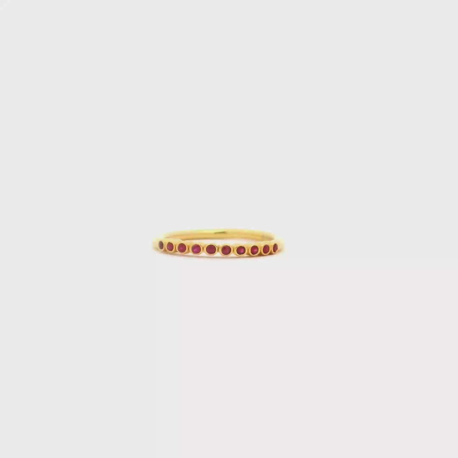 This yellow gold ring features smooth, round ruby cabochons bezel set in warm gold, creating a rich pop of color with a soft, luminous glow. The polished rubies feel both bold and refined, giving the ring a timeless yet unexpected character. Beautiful on its own, it truly shines when added to your stack, bringing warmth and personality to every combination. It’s an effortless way to introduce color while keeping your look elevated and intentional.