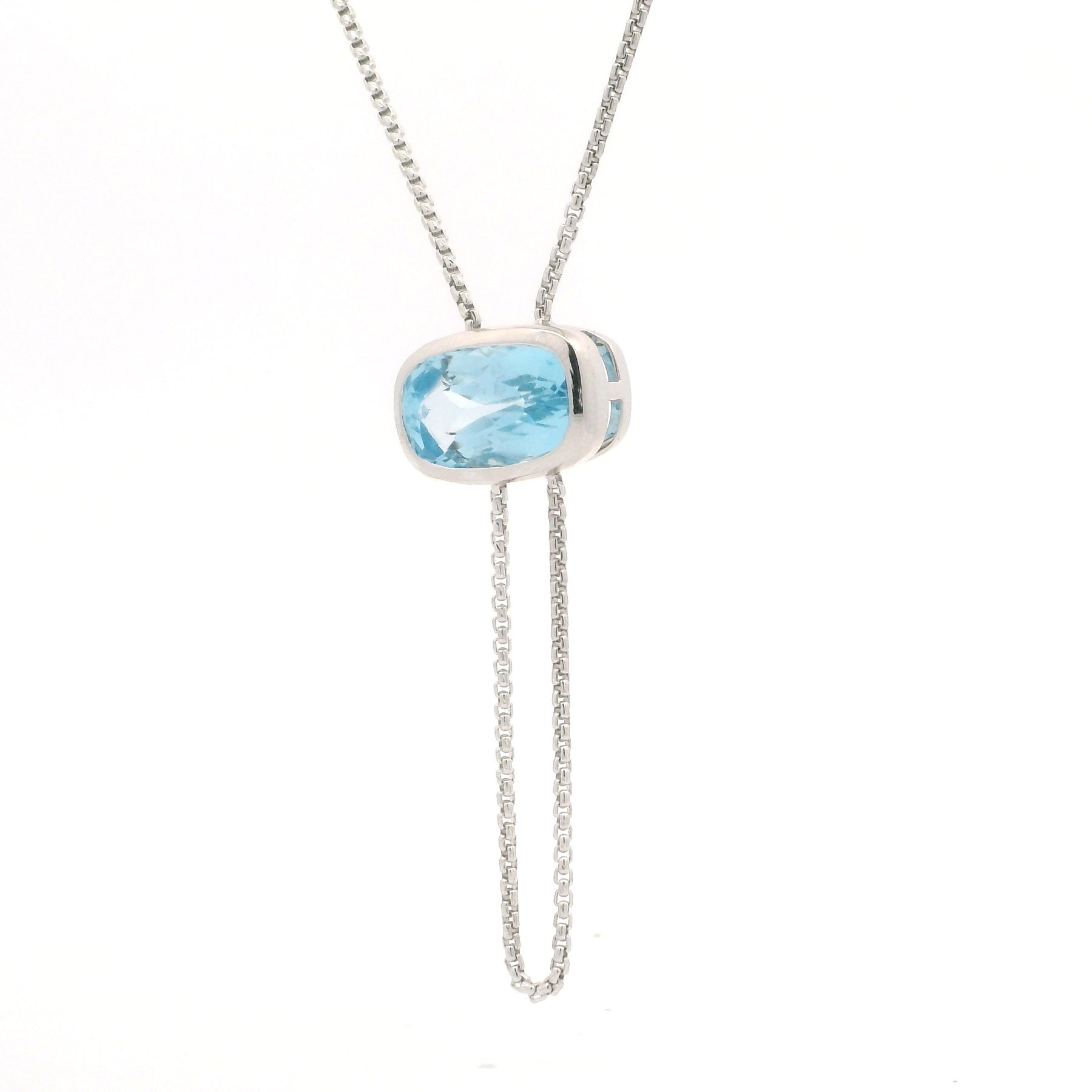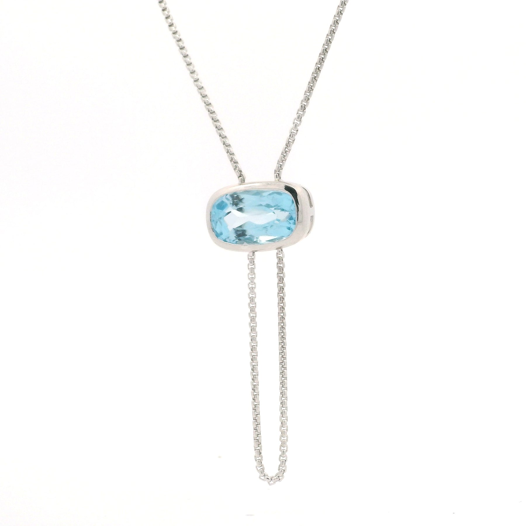 The Solara Collection Topaz captures the serene beauty of a clear blue sky. A stunning 10-carat topaz bezelled in white gold and suspended from a sleek 22-inch box chain. The stone is accented by a distinctive loop detail beneath it — a subtle, sculptural touch that sets this design apart. A modern classic with a hint of playfulness, it's the perfect statement piece for both everyday polish and elevated occasions.