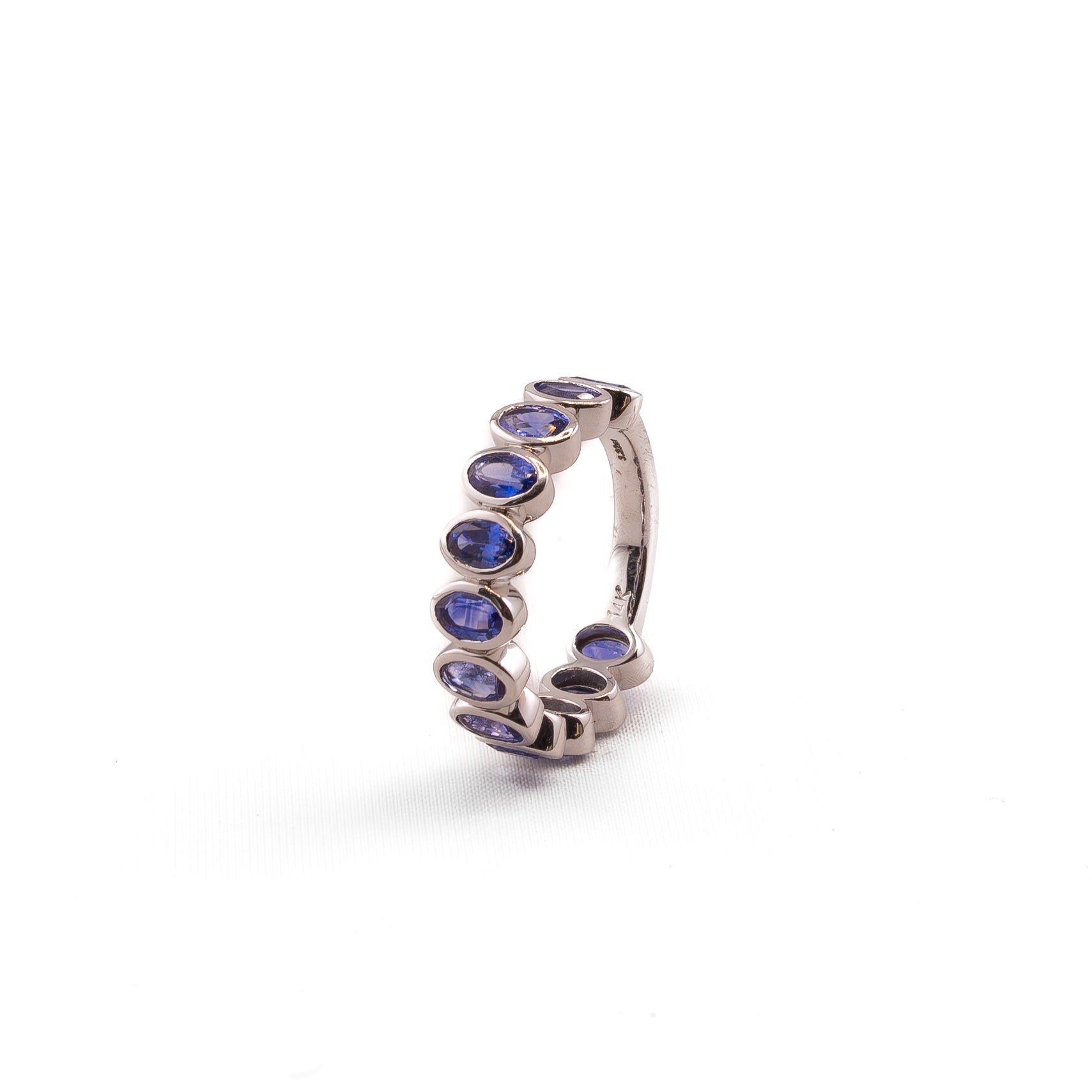 Oval blue sapphires bezel-set for a modern finish make this ring a beautiful addition to any jewelry collection. The smooth, contoured settings offer both security and a clean silhouette, allowing the rich blues sapphires to take center stage. Perfect for September birthdays, anniversaries, or other milestones, this ring is meaningful piece that radiates confidence, loyalty, and timeless beauty.