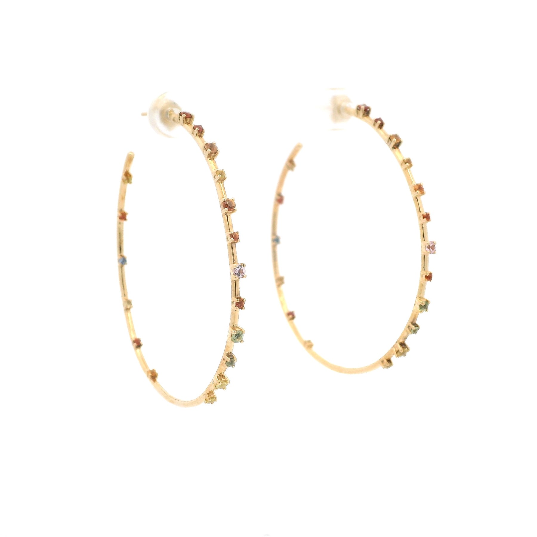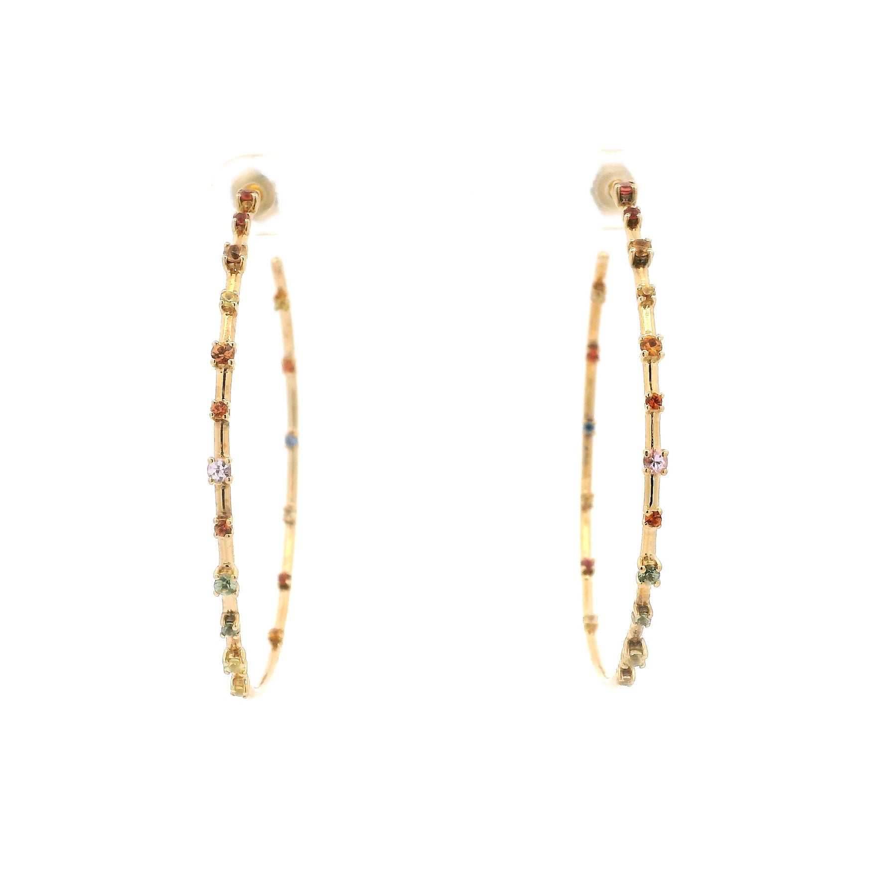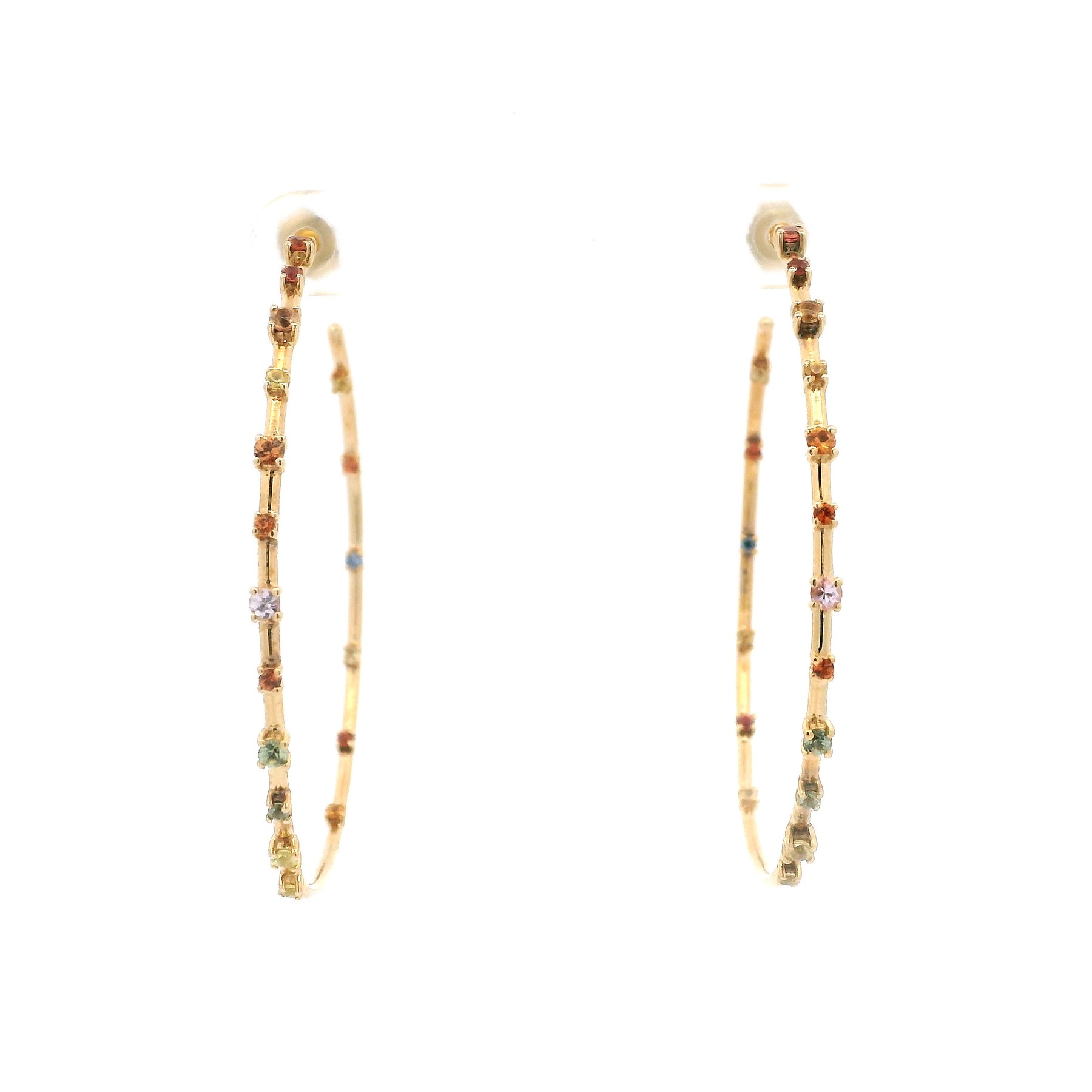 These exquisite gold hoop earrings are adorned with a delightful array of colorful round, brilliant-cut sapphires. The stunning sapphires are carefully set to showcase their colors, making these hoops a stunning and fun addition to any jewelry collection.